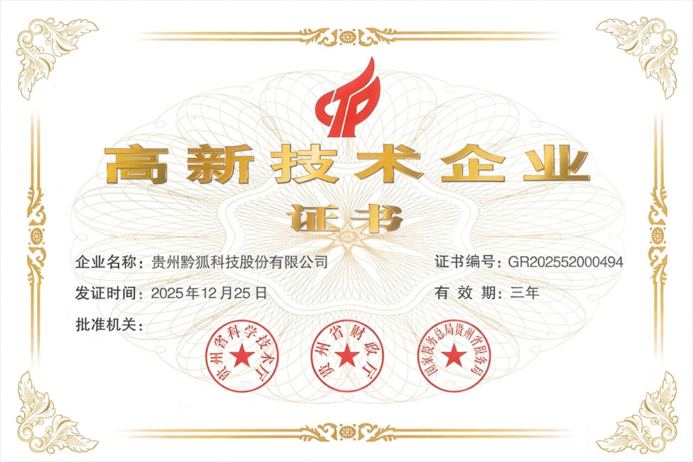 “国家高新技术企业”是我国科技型企业含金量最高的“金字招牌”,也是衡量企业科技创新能力与核心竞争力的重要标杆。该认定对企业核心自主知识产权、科技成果转化能力、研发组织管理水平、企业成长性等多个维度进行综合评审,旨在引导企业聚焦科技创新,走高质量发展之路。此次成功入选,是对黔狐科技长期以来坚持自主创新、深耕技术领域的权威认可。